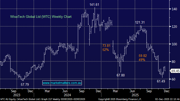 - We like WTC around $70, believing it has excellent upside potential when sentiment turns: we hold WTC in our Active Growth Portfolio.