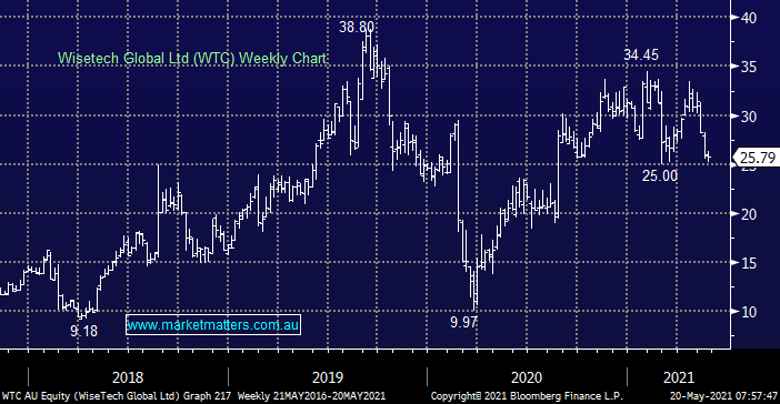 Cloud based logistics software designer WTC has been improving operationally with the current sector weakness starting to present some value in our opinion. If we get a washout to fresh 2021 lows on falling bond yields & $US we believe the risk / reward will become very attractive.