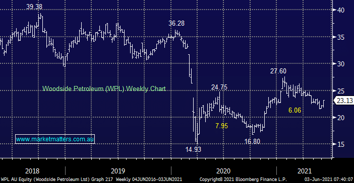 WPL has really struggled post COVID only managing to regain ~50% of its losses. We feel WPL is now in an accumulation area following its 22% correction in 2021 but we wouldn’t throw the kitchen sink at it, ultimately we prefer the production profile of Santos.