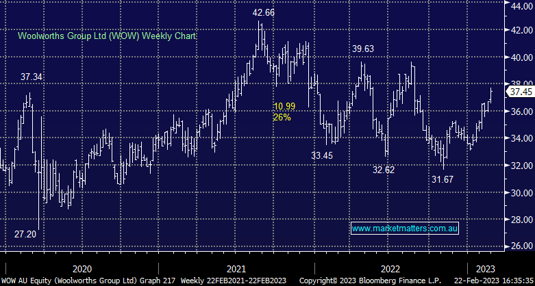 WOW +1.99%: Reported a ~2% beat to 1H23 consensus profit expectations this morning driven by higher margins in their food business. Sales of $33.2bn were up 4% YoY, just ahead of $33.1bn expected while NPAT of $907m beat the $875m pencilled in by the market – the interim dividend of 46cps was inline. In terms of guidance, they said the 1st 7wks saw Aust Food +6.5% YoY, NZ Food +6.3%, Big W +9.7% with commentary around food inflation interesting , they say it is impacting how consumers shop yet the impact on WOW has been modest to date. Group EBIT growth in 2H23 they say will be lower than 1H23.