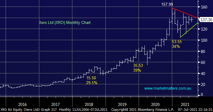 Local tech powerhouse XRO rallied almost 4% yesterday as the on-line accounting business continues with its holding pattern of 2021. For the budding chartists out there this stock is forming a classic flag structure which usually is the precursor for trend continuation, which in this case is up. Our view that XRO will eventually rally through $160 ties in with our bullish equities view into 2022.