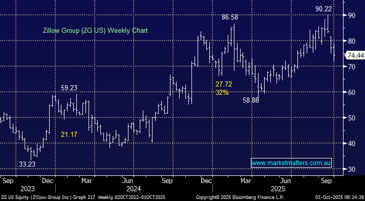 Consensus is expecting earnings to compound at ~35% over the next three years, justifying its current earnings multiple, particularly given its 15% pullback in share price.  This is clearly the type of stock that sits at the “pointy end” of risk-off trade flows, but history shows these are the dips are often the ones to buy—not sell. We continue to see Zillow as a long-term structural winner.