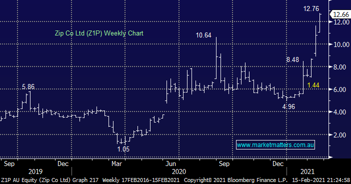“Buy now play later” (BNPL) high flyer Zip Co has now more than doubled in less than 5-weeks, its 4.6% short position must be getting extremely uncomfortable. We’ve discussed previously how “cheap” we felt Z1P was from a comparative valuation perspective with say heavyweight Afterpay (APT), before even considering the US  new comers, while this has clearly now been addressed to a certain degree with the stock now trading on a market capitalization of $7bn. We have flagged a $15 target however momentum is key in this stock and we’re inclined to trim as opposed to sell the stock if/when it trades above that level.