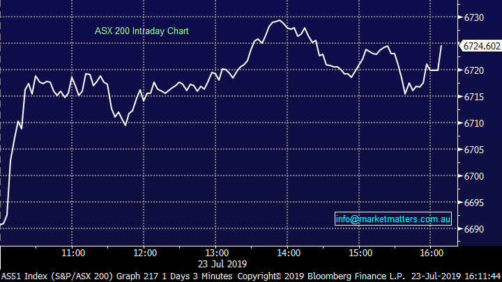 A fairly upbeat sort of day for the Australian share market with a strong open backed up by reasonable buying throughout the session. The Energy sector was best on ground while the Materials lagged, however all sectors closed higher implying good, broad based buying across the bourse.
