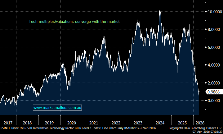 Relative Tech multiples to US market – source Bloomberg