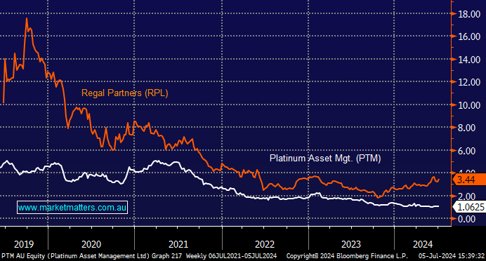 Picking a turn in high-yielding fund managers is fraught with danger but it can pay huge “dividends” – excuse the pun. We are long Magellan (MFG) and its soared +13% this week with a dividend due in August – its forecast to yield almost 7% over the coming 12-months. Its our preferred fund manager for yield but its been a tough few months into July.