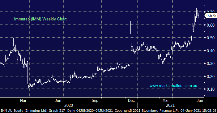 Immunotherapy biotech company IMM has kicked a few goals of late including gaining some European patent approval but after doubling since March this has clearly been factored into the share price. If we were investing / trading in this $470m business we would be looking to run stops under 60c because as we’ve seen over recent years it can endure some deep pullbacks.