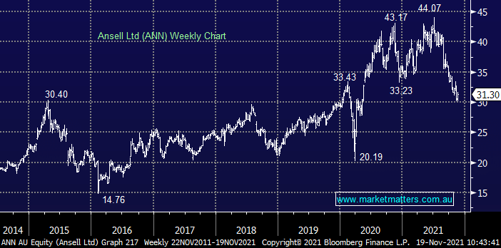 We like Ansell (ANN) after its 30% correction back towards $30, sub $32 the risk / reward looks very attractive.