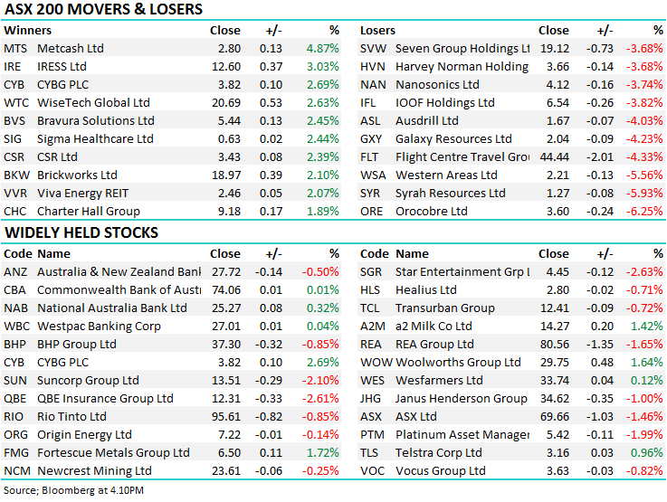 Overall today, the ASX 200 fell by -18 points or -0.29% to 6199. Dow Futures are currently trading down -19pts / -0.08%.
