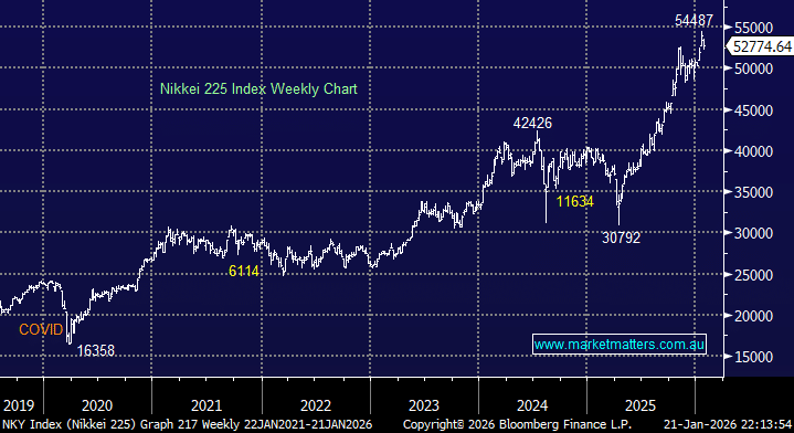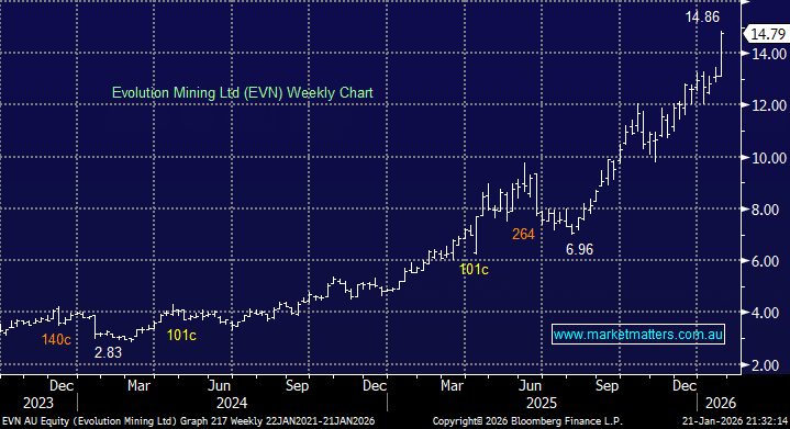 Monday saw the ASX 200 open softly and drift lower to close down -0.3% following President Trump's threats to impose levies on countries opposing his plans to take control of Greenland. Conversely, safe-haven demand pushed gold to fresh all-time highs near $US4,700, while silver surged more than 4%, also notching new record highs. Not surprisingly, gold stocks followed suit, but if MM is correct, it’s time to consider taking some money off the table in precious metals.