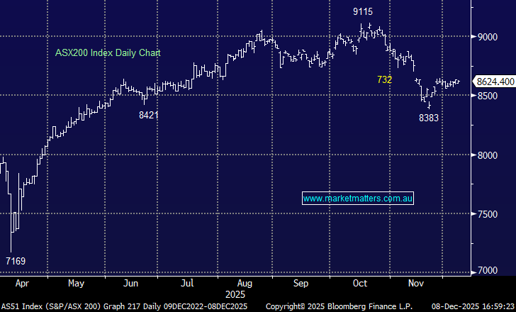 The ASX200 tried and failed to close above 8600 on Tuesday, with mining and energy stocks again supporting a nervous index. However, ongoing weakness in the rate-sensitive stocks saw the tech -1.6%, utilities -0.4%, and consumer discretionary -0.3% sectors all retreat as bets increased that the RBA will hike rates through 2026 - traders are now pricing in a ~70% chance that Michele Bullock & Co move +0.25% by next Christmas.