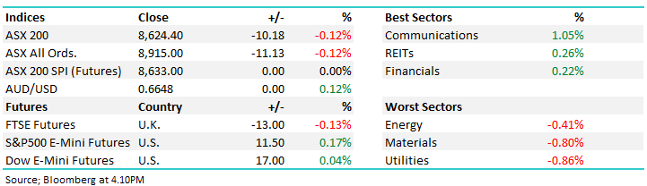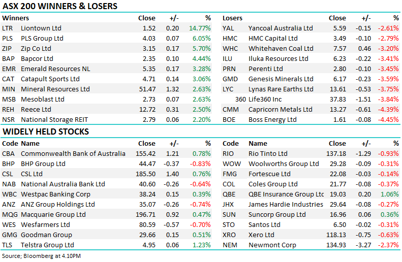 The ASX finished lower as investors moved to the sidelines ahead of tomorrow’s RBA policy decision, with sentiment soft despite a modestly positive lead from Wall Street and little in the way of corporate news flow to drive individual names. Lithium names were a bright spot following last week’s sector upgrade however this was offset by gold stocks which retreated as bullion eased over the weekend.