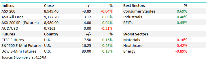 A weaker session thanks to a few large index weights disappointing, particularly amongst the resources, however worth noting some strength came through from the intra-day lows as Chinese equities bounced. It may sound like we’re clutching at straws, but there is growing evidence that China will get a handle on its economic woes, and we often see stock prices pre-empt such turning points.