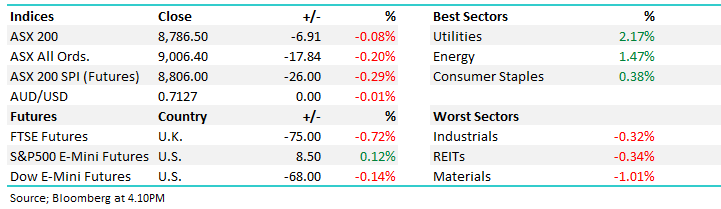 The ASX200 finished a choppy session little changed on Tuesday, for a third straight session, amid a looming US-Iran ceasefire deadline and continued tensions over control of the Strait of Hormuz. Overall, it was a quiet session on both the stock and sector front with only the consumer staples (+0.76%) and energy sector (-0.9%) moving by more than 0.5%, with the index remaining range-bound between 8890 and 9020 for the 10th consecutive session.