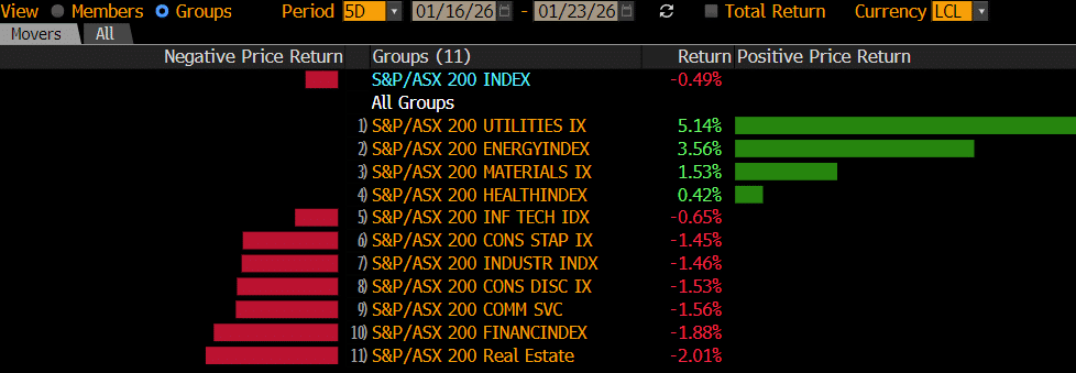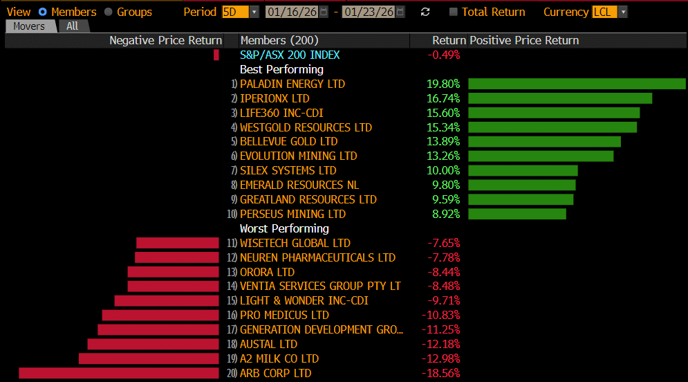 The ASX 200 bounced +0.8% on Thursday, driven higher by a robust banking sector - the financials contributed 80% of the index's 66-point gain. The gold sector dominated the losers' enclosure as the precious metal lost its shine following Trump's more balanced speech from Davos, which notably stated that the US wouldn’t invade Greenland or impose tariffs on European nations in February.