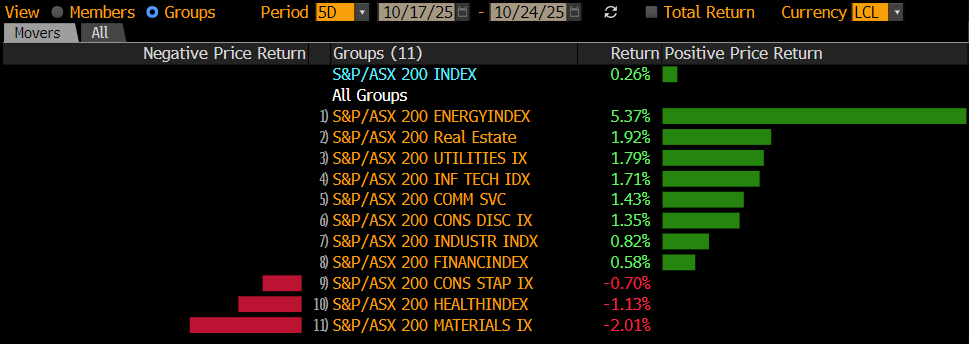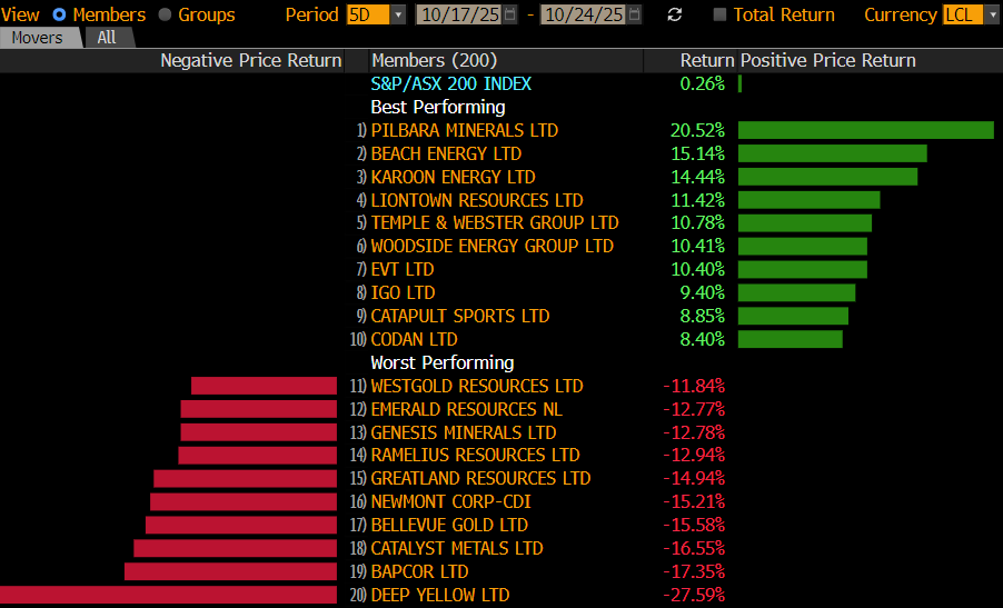 The ASX200 ended the week up +0.4% but it looked so much stronger into lunch on Thursday, with the index pushing through 9100 for the first time in its history after soft local employment data lifted the market's hopes for a rate cut on Melbourne Cup Day. However, the broad market struggled on Thursday afternoon and especially on Friday, with the gold stocks the main reason we didn’t finish the week in negative territory as the precious metals continued to march ever higher. Monday is poised to deliver some major reversion with many stocks that struggled last week likely to enjoy a bid, and vice versa.