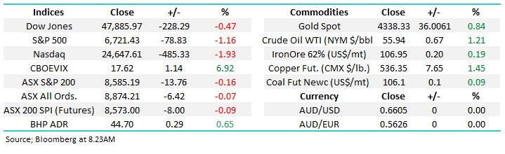 The ASX slipped into negative territory through the session as early strength in the banks was offset by sharp weakness across technology and energy stocks. Investors remained cautious ahead of delayed US labour market data for October & November due tonight, which could shape expectations for further Federal Reserve rate cuts into 2026.