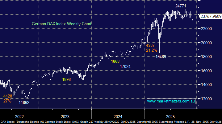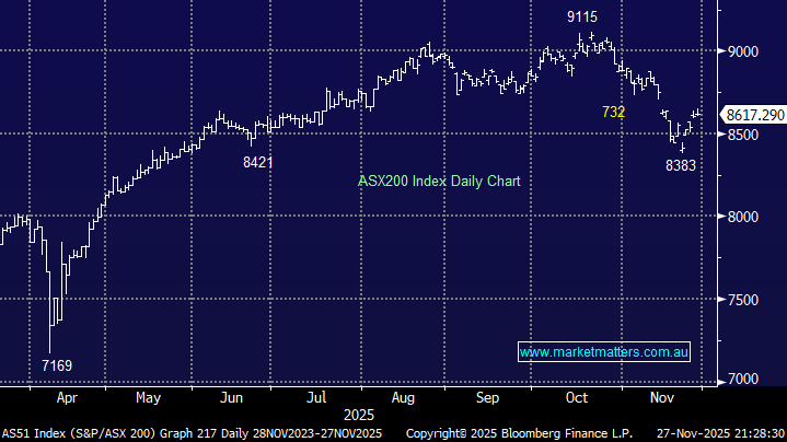 The ASX 200 ended the week down another -2.5% with only the defensive natured consumer staples sector managing to eke out a small gain. It was the local market's worst week since “Liberation Day” with the index closing at its lowest level since June, on a combination of worries around stretched valuations and the direction of interest rates. On Friday, the local bourse closed 7.7% below its all-time high posted in October when the prospect of lower rates was managing to offset lingering fears around frothy valuations.