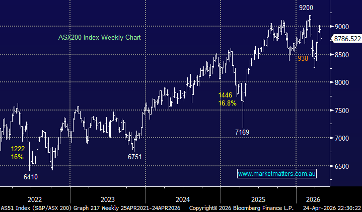 The ASX200 ended the penultimate week of April, surrendering -1.8% of the month's gain, with a string of profit downgrades combining with the country’s high vulnerability to the global fuel crisis caused by the Iran war - the oil price continues to grind higher with no clear resolution in sight for the conflict. A wave of profit downgrades swept the ASX, led this week by Cochlear’s earnings shock, which sent its shares plunging 40%. Other companies warning that surging energy costs will weigh on earnings included Qantas, Worley, a2 Milk, Orora, Cleanaway and Qube. The ASX is also struggling because its two heavyweight sectors have come off the boil, the banks and resources.