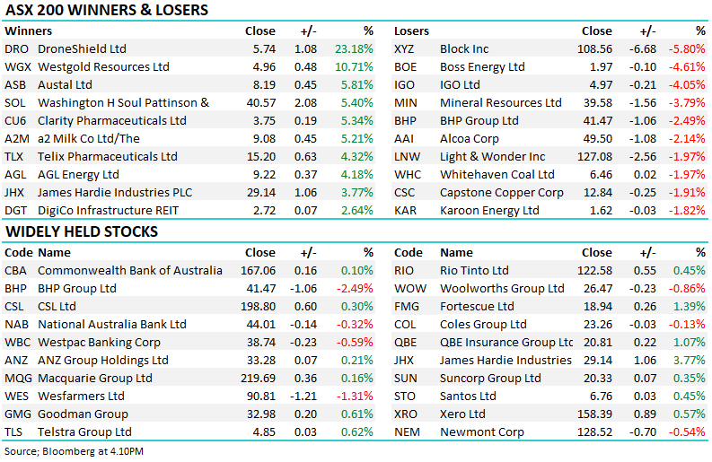 Copper stocks were the place to be today, with the sector rallying strongly following production issues at Freeport McMoran’s Indonesian operation, with no clear time frame for resumption. The move in Copper (+4%) highlights how tight the global market is for this critical input, highlighting why we remain bullish over the medium term. Stocks with exposure here from Sandfire (SFR) +7.6% to Aic Miners (A1M) +9.7%, Capstone (CSC) +10.8% and even BHP +3.6% led the line today, mirroring moves seen across copper companies globally. Elsewhere, banks were mildly better after a tough session yesterday, while the market recovered nicely from early morning weakness, the finish up 35 points from the morning lows.