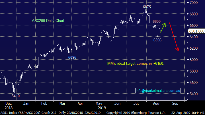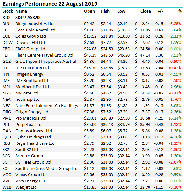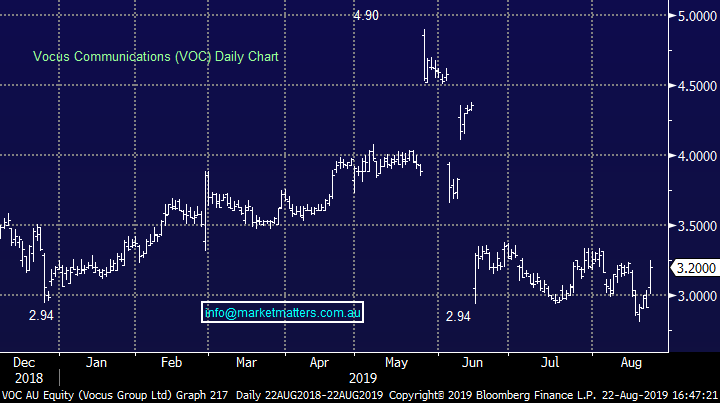 Vocus (VOC) +9.59%: A better result on all metrics with FY19 earnings meeting / beating expectations while guidance was also better than the street. While VOC remains fairly heavily geared, and a bevy of suitors have looked under the hood and left in a matter of days, the struggling Telco guided for better FY20 earnings saying EBITDA would be in the range $359-$379m versus current expectations of $363m…hard to like the stock but a beat none-the-less. Technically looks bullish…
