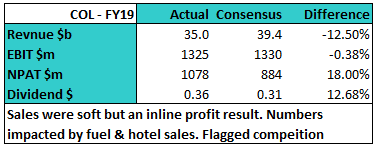 Flight Centre (FLT) +7.53%: Was one of the best performers in the ASX200 today, trading around 10% higher in the session thanks to a solid full year report. The key line for Flight Centre is the pre-tax profit number which was right in the middle of guidance and met expectations. The result was driven by an 8.8% lift in total transaction volume despite a low number of sales staff. The leisure market has been under pressure over recent years and TTV was flat again for FY19, however the company is continuing to shut, re-brand or re-locate stores in an effort to reduce costs. The Australian business saw PBT down 30% as a result of the subdued trading conditions, however growth in the Americas offset much of the fall. Corporate travel has also been a growth driver for Flight Centre with a number of recent acquisitions in the space, contributing to nearly 40% of profit at the result. We continue to like FLT and hold it in the income portfolio