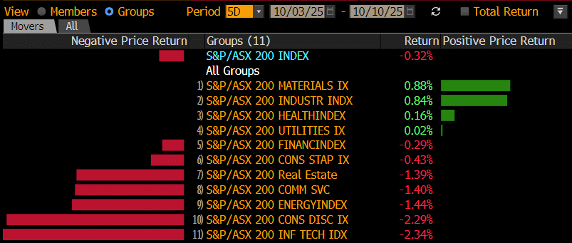 The ASX clawed back early weakness on Friday down about ~25pts early but rebounded strongly with a +40pt rally, edging into positive territory as strength in miners and the big banks offset heavy losses across healthcare, though only four of eleven sectors ended in the green.