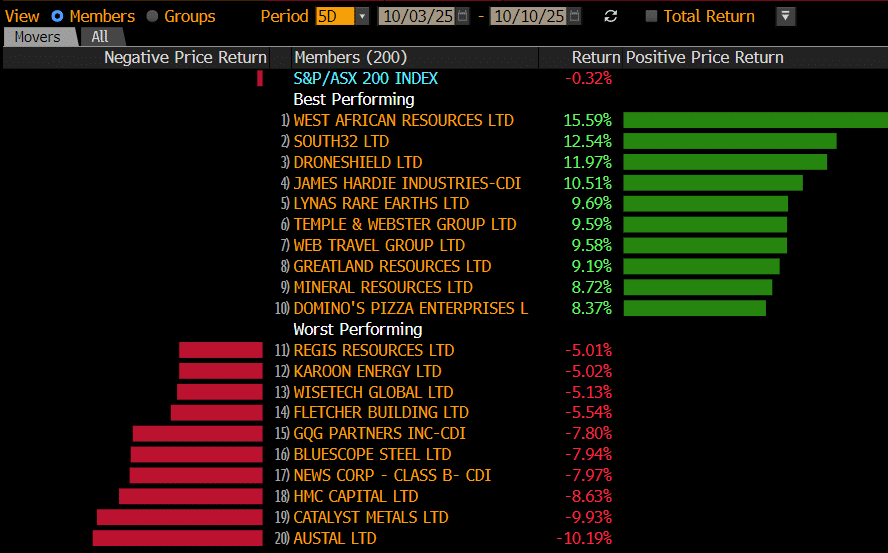 The ASX closed lower for the week, with today’s session capped by a risk-off tone as peace headlines out of Gaza knocked the shine off oil and gold, while iron ore heavyweights fell on renewed pricing tensions with China.