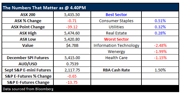 The market opened down smalls and tread water until weaker than expected trade data from China + a weak open on the US FUTURES got the sellers active and we saw the market trade down as much as -54pts before a tepid recovery into the close. We had a range today of +/- 48 points, a high of 5468, a low of 5420 and a close of 5435, off -39pts or -0.71%. Volume was good today and it seems we’re back into the swing of it post school holidays.