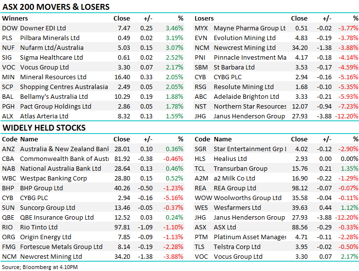 Janus Henderson (JHG) - 12.20%:We covered this morning however the selling was sustained in the stock throughout the day – eventually closing near the lows. In the AM report we suggested…This is an example of a “cheap stock” remaining cheap for a while, we now prefer Pendal Group (PDL) for similar market exposure / risk, PDL is likely to be dragged lower if JHG does get smacked today – it opened down only 3.7% in the US but then slipped lower all night with the weak market. Hence the price differential for the switch is unlikely to be too painful.