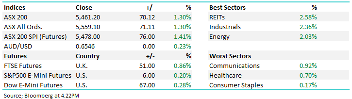 Today the ASX 200 added +70pts / 1.30% to close at 5461 - Dow Futures are trading up +67pts/+0.28%