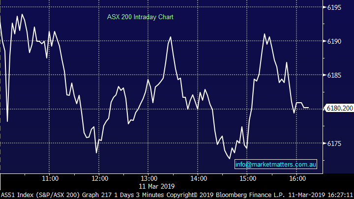 A choppy session for Aussie stocks today with the market hit by selling early and it never really managed to get off the mat US Futures were trading down for most of the session – Asia was mixed however there was a fair bit of stock / sector news bubbling away under the hood. Retail sales out tonight in the US which will be interesting…the start of the December rout in US stocks coincided with a poor retail sales print, so tonight’s read will be important, particularly given employment data was weak on Friday night.