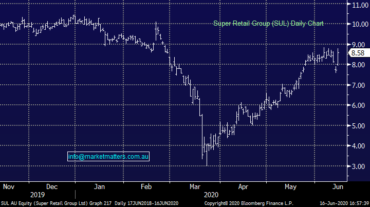Super Retail (SUL) +10.96%: We’ll cover more on this in the Income Note tomorrow given we hold it in that portfolio, however the retailer came back online today after raising capital via an institutional placement, however there’s a retail component which we’ll participate in. While the stock rallied in a strong market, the move highlights the importance the market is placing on balance sheets. SUL carried higher gearing than the broader sector and the fact they’ve addressed that, at a good level is a win for the stock, hence the rally on the mkt today. We remain positive.