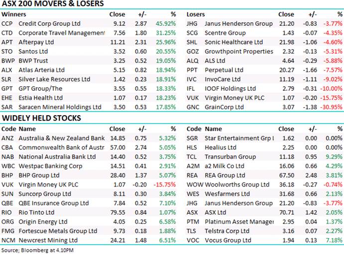 Magellan (MFG) +11.58%:A decent bounce for the fund manager today after a tough month. Buying into weakness will gravitate towards the No 1 players in each sector, it’s the reason we switched from PDL into MFG recently and that was the theme that played out today, most of the other fund managers were down. We like MFG at these levels.
