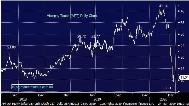 Afterpay (APT) +25.96%: clawed back a portion of the savage sell off the stock has encountered over the past few weeks - it peaked on 20 Feb at $41.14, falling 80.5% to yesterday's low of $8.01 in just 23 sessions. Today's support was found on directors picking up a few shares into the weakness. Two directors bought a total of 14,790 shares on Friday - around $100k each, while one lucky director nabbed 19,300 at a little under $9 yesterday.