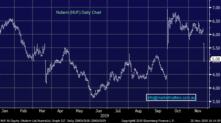 Nufarm (NUF) -17.53%; the crop protection business saw its shares slugged today after the company flagged a number of issues impacting the first half to the point where the company was not able to give guidance for the six months to January 2020. The problem was the company recognizing a number of sales rebate claims from German customers from FY19 which will drag EBITDA but around $9m, or ~2% of FY19 EBITDA. Nufarm have also needed to implement a review of procedures in handling these claims because a number slipped through the cracks which may also mean increasing costs.