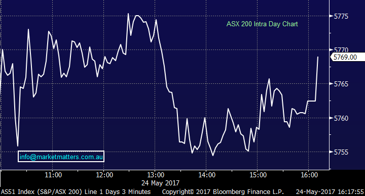 A choppy session for the market today with the index opening reasonably firm before an exchange issue in the options market saw the mkt drop off a cliff from around 1pm. It recovered from the lows just enough to pop back into positive territory. The Industrials saw strength while Utilities, Materials and Financials were the weakest links - a tight range today of +/- 21 points, a high of 5776, a low of 5754 and a close of 5769, up +8pts or +0.15%.