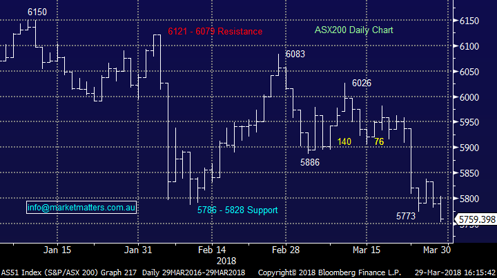 It seemed like the Aussie market started the Easter break early today with the index opening firmer before tracking lower throughout the session eventually closing on its lows – not surprising really given that the US market is open for 2 sessions (Friday and Monday) while we’re chewing the ears off a few chocolate bunnies. The family and I will be around Nelson Bay for the break – four days off is always a luxury and here’s hoping that a few fish are biting around the reefs off the coast of Hawkesnest. I’ll (hopefully) have some reasonable pics for the MM community come Tuesday!