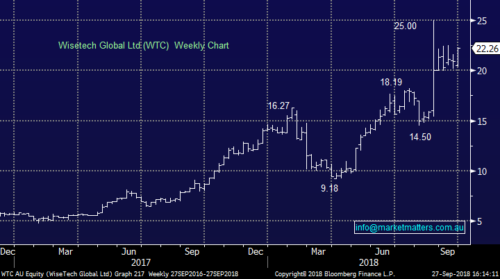 Wisetech (WTC) $22.26 / +4.12%; After a month of consolidation money is coming back into the tech space with both Wisetech and Afterpay seeing some good flow today - adding 4.12% and 4.89% respectively. These are clearly high growth momentum plays and from today's price action it seems the shorter term players are once again getting behind the sector. WTC looks particularly bullish after a period of consolidation while APT experienced a deeper pullback from its August highs, although it has raised around $100m in new equity during that period. Momentum players could buy WTC with stops below $20.00, which is okay risk/reward however we're overall cautious the growth stocks at this point in time.