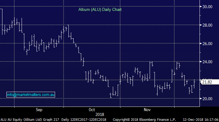 Broker Moves; This morning Goldman Sachs initiated coverage on Altium (ASX: ALU), a stock we hold in the Growth Portfolio, with a buy and fairly aggressive price target of $28.50, versus yesterdays close of $20.60. A move like that is obviously positive but more importantly, the new coverage from a bulge bracket brings a new cross section of clients that now have ALU on their radar. Goldman’s provide research for Com Bank which has the largest retail network in Australia through Commsec. I’m not sure of the timing that research is released through the network (probably a delay) however we’d expect it to generate additional interest / buying in the stock. We remain bullish ALU targeting the $24 region in the short term. The stock added 5.56% today to close at $21.82.