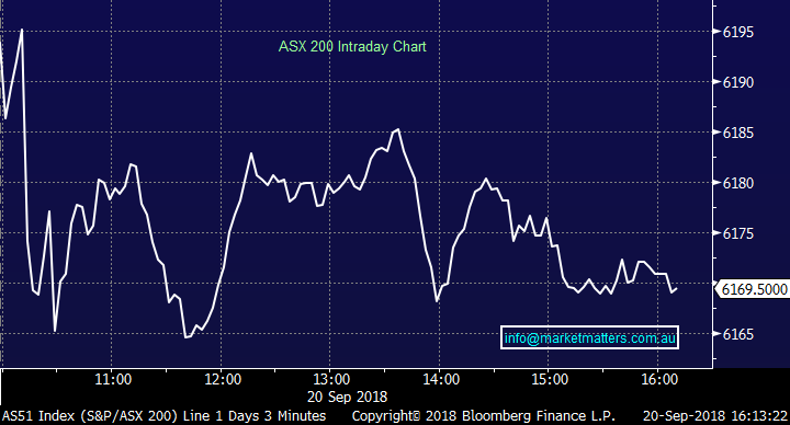 A mostly subdued day on the market today which lacked the volatility many were expecting following the September futures contracts expiring. The index spent most of the day in a tight ~22 point range between 6163 & 6185. Materials caught a bid again although the buying wasn’t across the board – mostly focussed on gold stocks and the big end of town which is poised to return capital to shareholders. Rio Tinto announced a big share buyback today which helped shares climb over 3.5% - more on that later. Healthcare was also strong following CSL, which we discussed in yesterday’s report, bouncing off the $200 support it reached early in the trading day. On the other end of the spectrum, anything tied to interest rates were sold off as US Treasury yields hovered around year to date highs of 3% – industrials, consumer facing & REITs all finished lower.