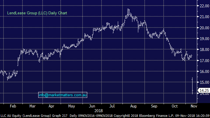 Lend lease (LLC) $14.20 / -18.34%; This morning Lend Lease (ASX:LLC) came out with a downgrade saying that they anticipate taking a ~$350m after tax impairment charge against its Engineering division in 1HFY 19. This has been a problematic part of the LLC operation for some time with such slim margins offering very little cushion if one of two projects have issues.