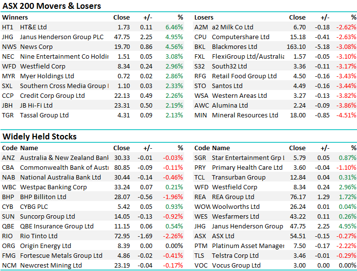 The Australian market today eased slightly after a poor lead from overseas markets. News of delays to Trump’s tax plan weren’t taken well and our futures market was pointing down ~25 points before trade, around about where we finished today. Resources were hit hard today, which was unsurprising given BHP had fallen the equivalent of 2.5% overnight. Rio fell 2.3% which has erased the week’s gains. Banks were also worse off, but once again it was the cum-dividend banks that fared best with money looking for yield, WBC and ANZ both go ex-div on Monday. Overall, a range today of +/-18 points, a high of 6038, a low of 6020 and a close of 6029, off 20pts or -0.33%.