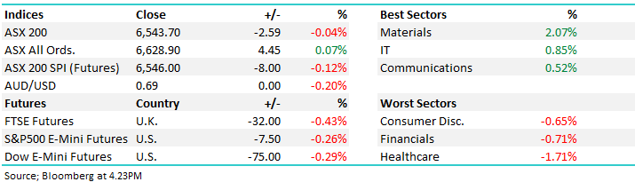 Overall today, the ASX 200 fell -2 points or -0.04% to 6543. Dow Futures are trading down -75pts / -0.29%.