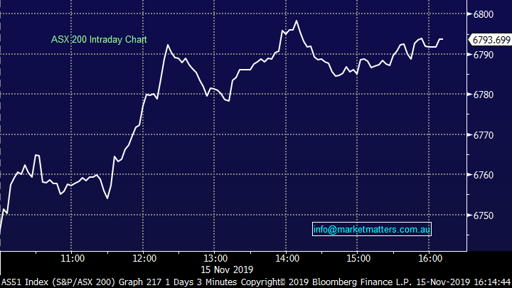 The market finished the week on the front foot today as it traded to within a whisker of the 6800 handle on the back of some broad based buying. Increasing calls for another cut from the RBA sooner rather than later sent the local currency lower again and renewed the markets positive bias. This week the market managed to put on 69pts, with all the work being done across Thursday and Friday. It seems the next test here will be the all-time high – the highest close being 6845 on 30 July less than 1% away.
