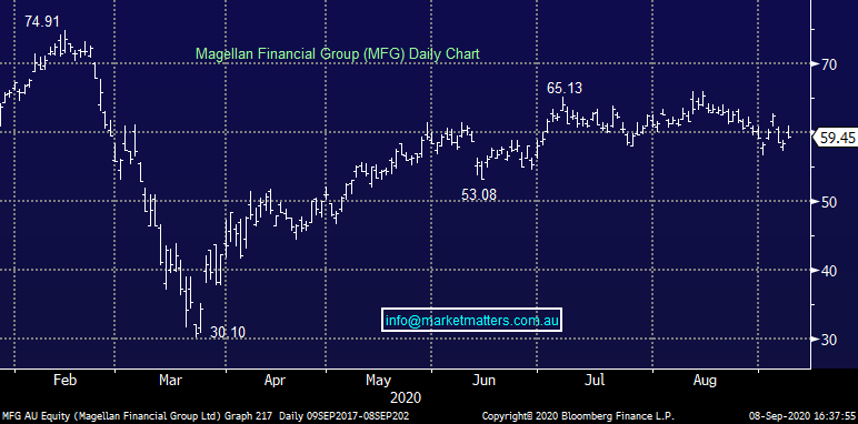 Credit Suisse upgraded Magellan (MFG) this morning talking up the prospects of their consolidation strategy (MFG plan to combine its three global equity funds into a single, open-ended strategy). CS lifted its price target by 8.3% to $65. We added the stock to the MM Growth Portfolio yesterday. Consensus price target for MFG sits at $60.42 however brokers are always chasing their tail on this one.
