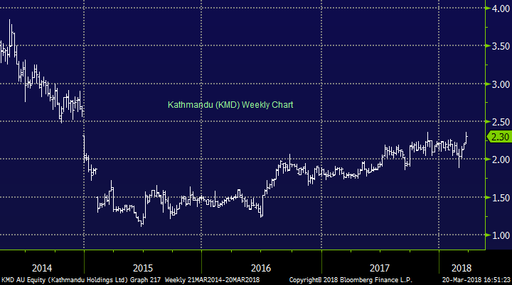 In the case of KMD, they trade on 12x and a 6% yield which is about the average they’ve traded at last year, however in 2016 they had an average PE of 15x, so we’ve seen a decline in earnings + a re-rate on the multiple. The acquisition announced today, while not huge is a step in the right direction. It will be EPS accretive by mid-single digits by FY19 and is a clear move in the right direction which could underpin a multiple re-rate and see the stock price rally back reasonably hard.