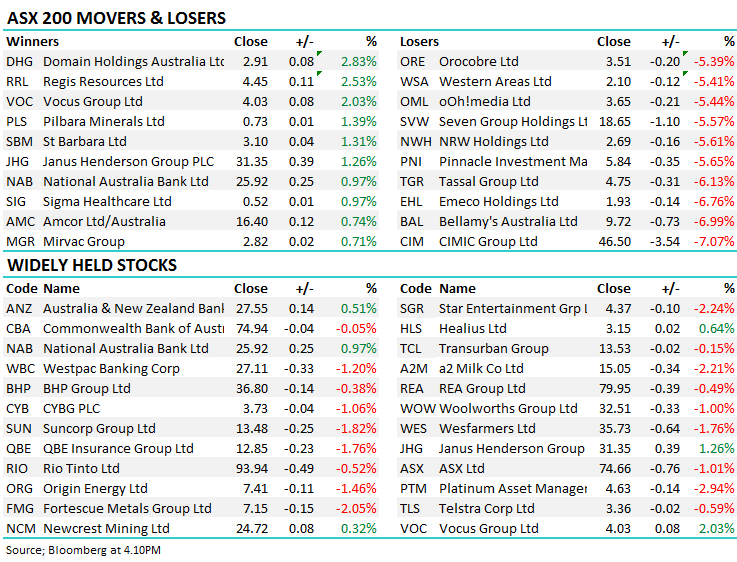 Understandably, it was the China facing stocks that felt most pain today while stocks that could benefit from a potential rate cut tomorrow held up okay. (RBA decision tomorrow afternoon @ 2.30pm) .