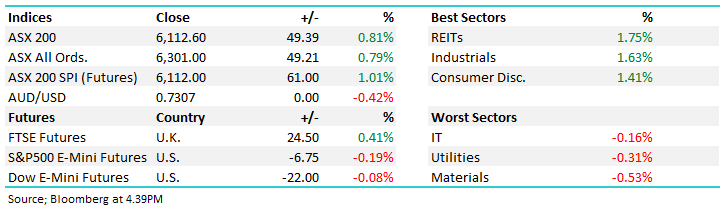 By the close, the ASX 200 was up 49pts / +0.81% to 6112. Dow Futures are trading down -22pts / -0.08%
