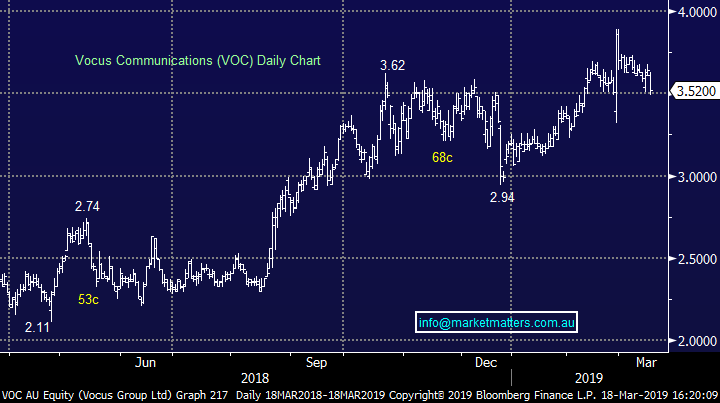 News in the AFR this morning that Vocus Communication (VOC) -3.3% was about to press the button on an equity raise was hosed down by the company – with the Telco saying....Vocus Group Limited (“Vocus”, ASX: VOC) notes press speculation this morning regarding a potential equity raising. Vocus refinanced its debt facility in June 2018 and as stated in the Interim Results presentation on 27 February 2019, net debt peaked during H1 FY19 after funding the Australia Singapore Cable. The Board and management remain comfortable with Vocus’ debt position. There is no current intention to raise additional equity.